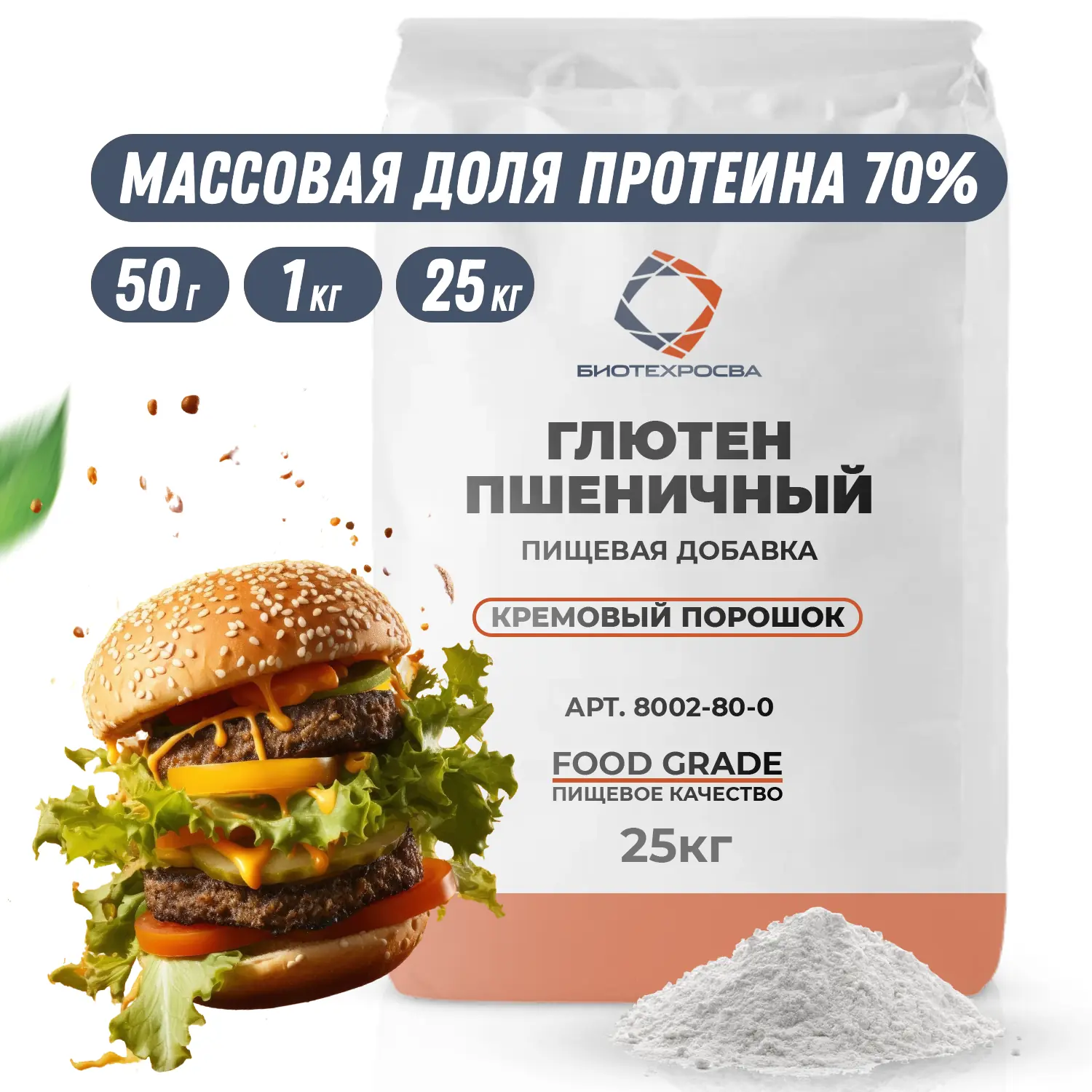 Белок пшеничной муки в виде порошка. Глютен пшеничный- это белок растительного происхождения, продукт глубокой переработки пшеницы, обладающий высокой влагоудерживающей способностью. В пищевой отрасли клейковина предназначена для повышения качества исходного растительного сырья. Сухая пшеничная клейковина связывает и удерживает воды в 2 раза больше собственной массы, что, например, существенно улучшает реологические характеристики слоёного, дрожжевого и бездрожжевого теста, повышает его упругость, растяжимость, что определяет его ценность и основные сферы применения.