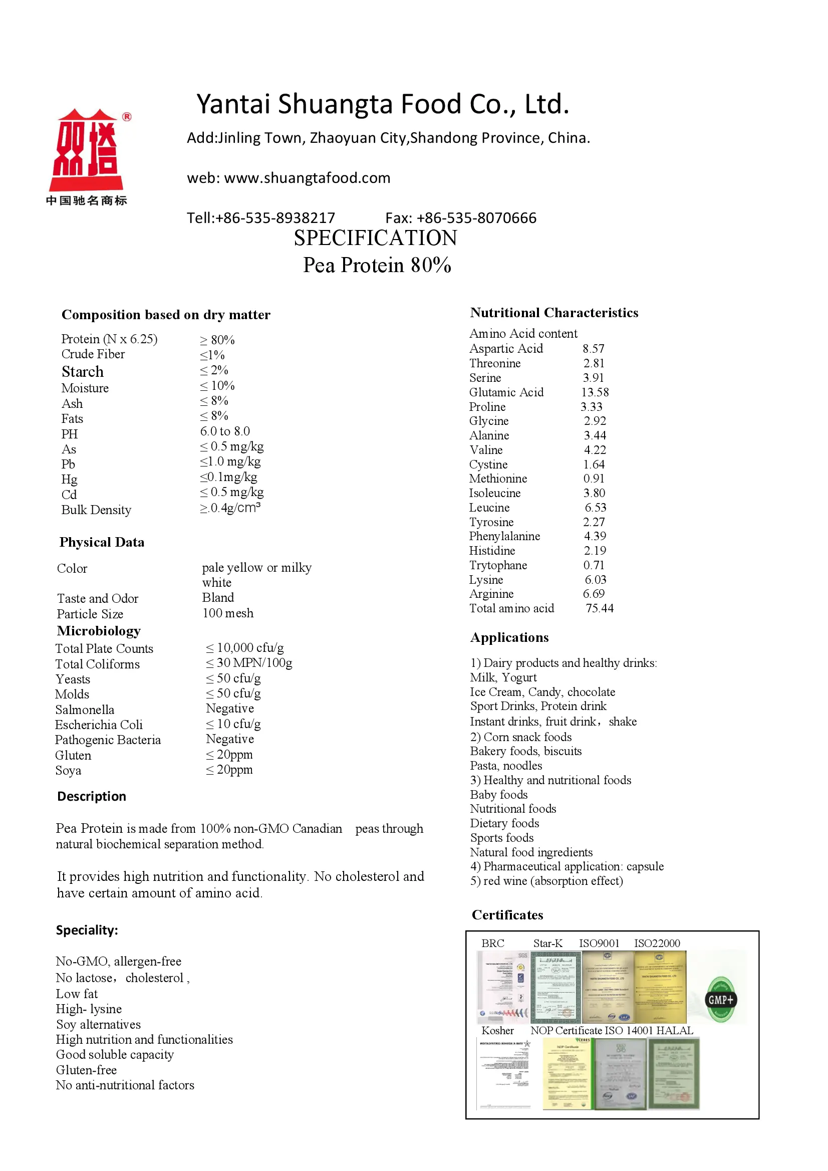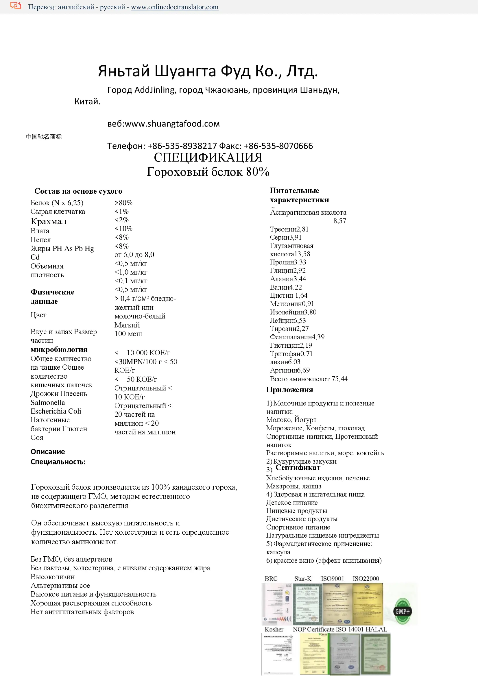 Применение: гороховый протеин применяется в производстве молочных продуктов и напитков (молоко, йогурт), мороженого, конфет, шоколада, спортивных напитков, протеиновых напитков, фруктовых напитков, коктейлей, растворимых напитков, хлебобулочных изделий, макарон, лапши, печенья, красного вина. Часто используется в составе детского питания, спортивных и диетических продуктов (протеиновых порошках, коктейлях, батончиках), БАДов и здоровом питании, в качестве натурального источника растительного белка в различных пищевых продуктах.