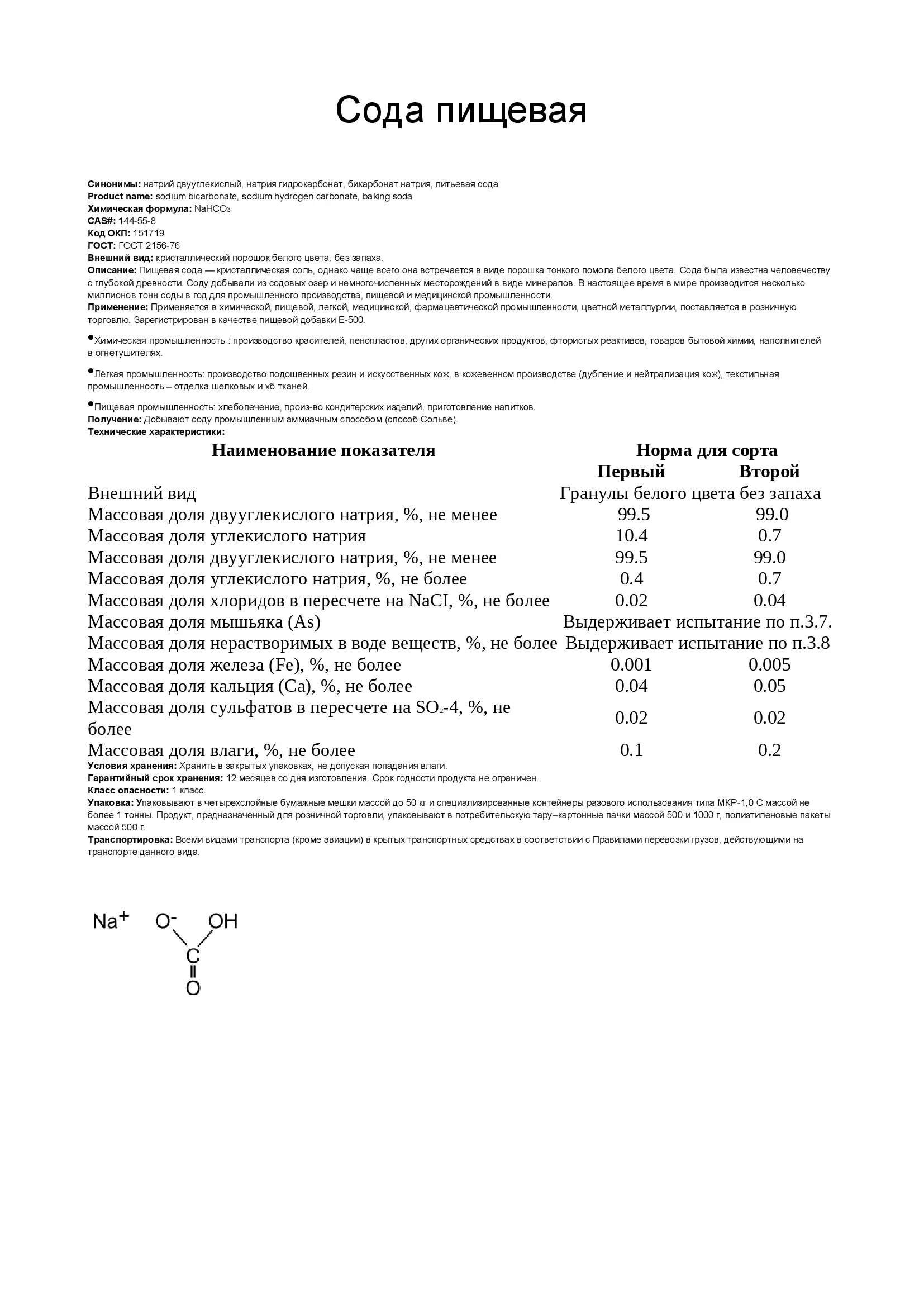 Применение: Применяется в химической, пищевой, легкой, медицинской, фармацевтической промышленностях, цветной металлургии, поставляется в розничную торговлю. Зарегистрирован в качестве пищевой добавки Е-500.