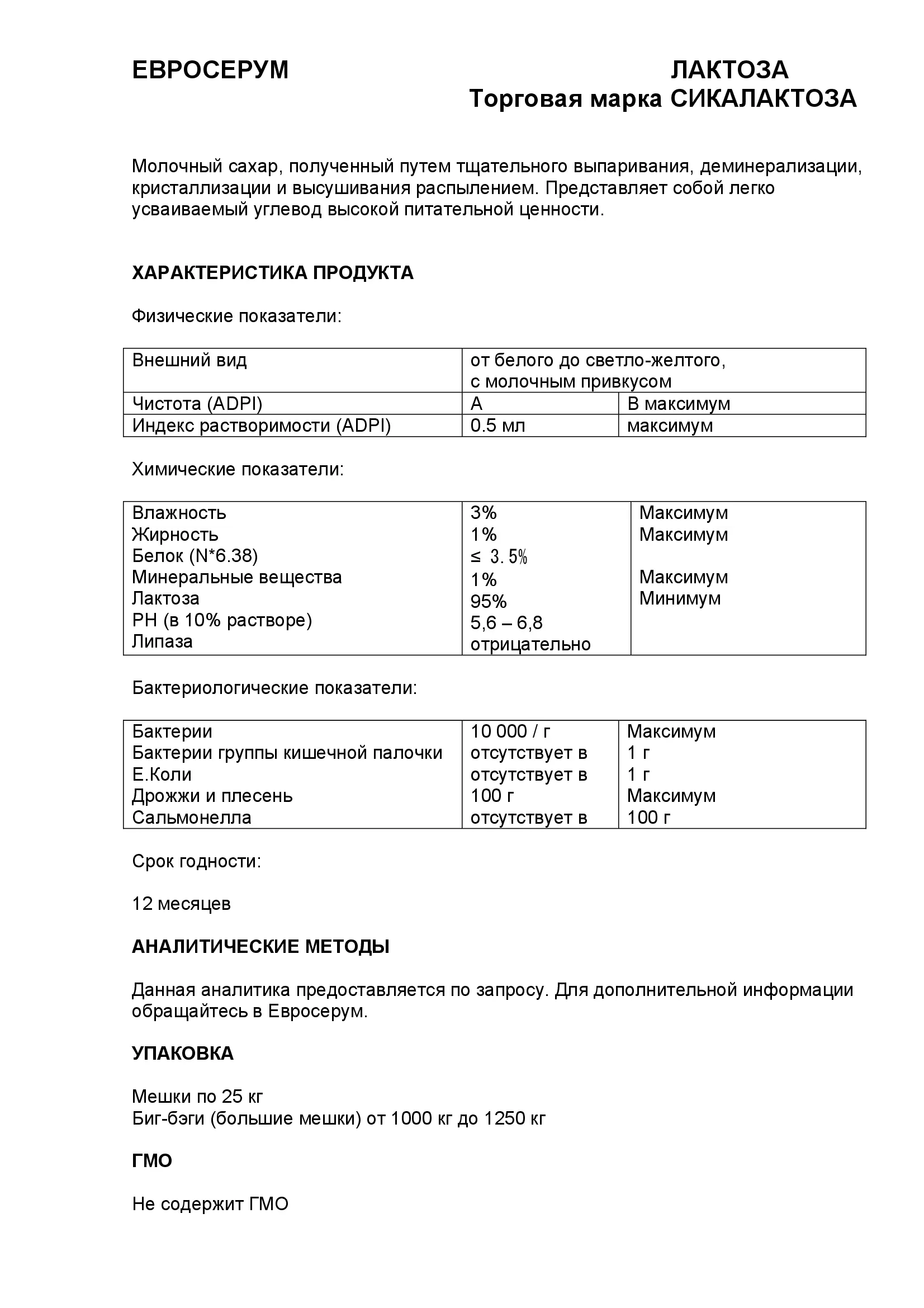Применение: лактоза обладает рядом преимуществ, которые позволяют оптимизировать процесс производства: экономическая выгода за счет увеличения объема продукции, существенное улучшение потребительских характеристик продуктов, возможность уменьшить расход сахара в рецептурах делает продукты более диетическими, а увеличение питательности и биологической ценности, увеличение срока хранения, удобный формат порошка позволяют легко дозировать добавку, кроме того она не нуждается в особых условиях хранения и транспортировки.