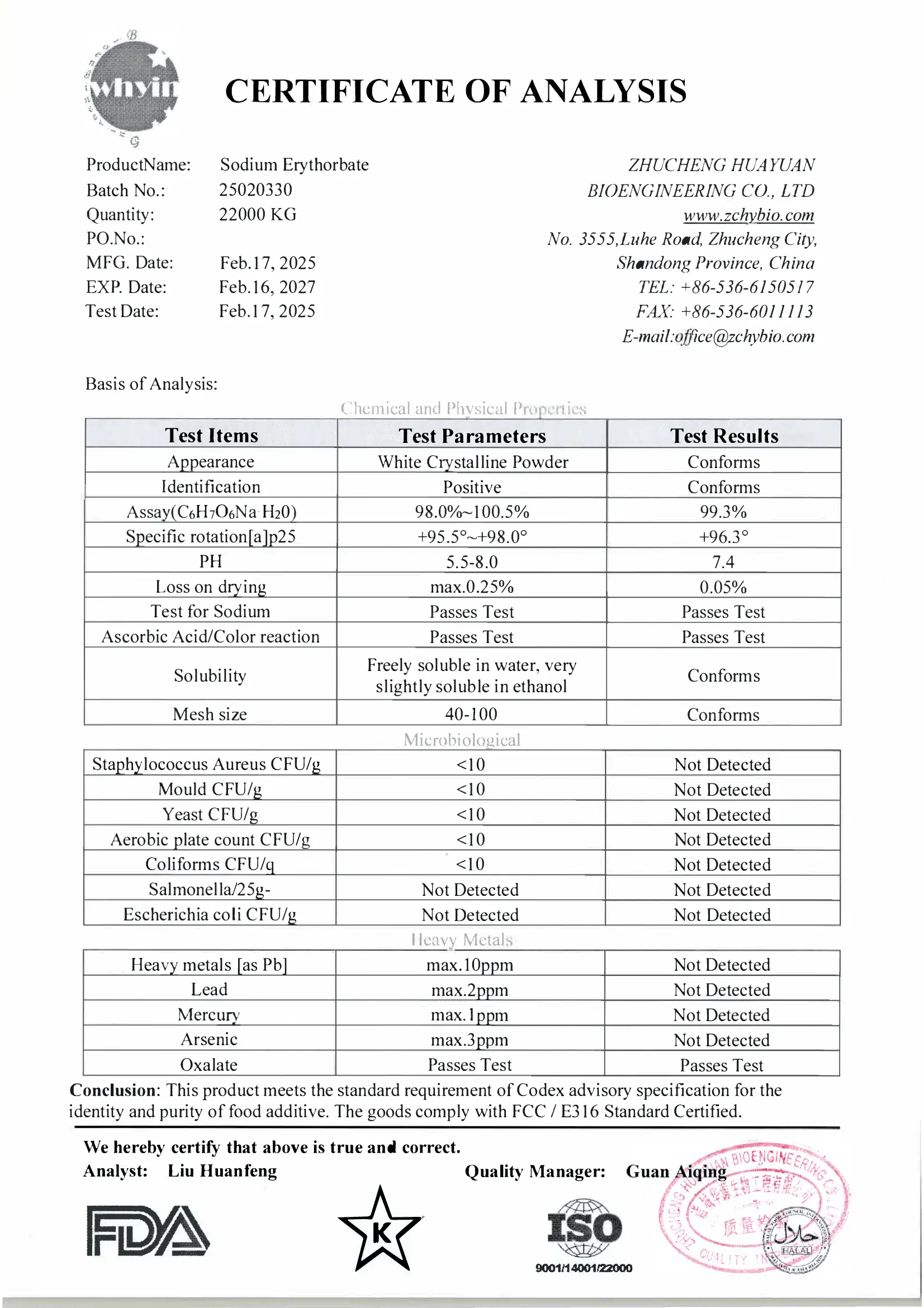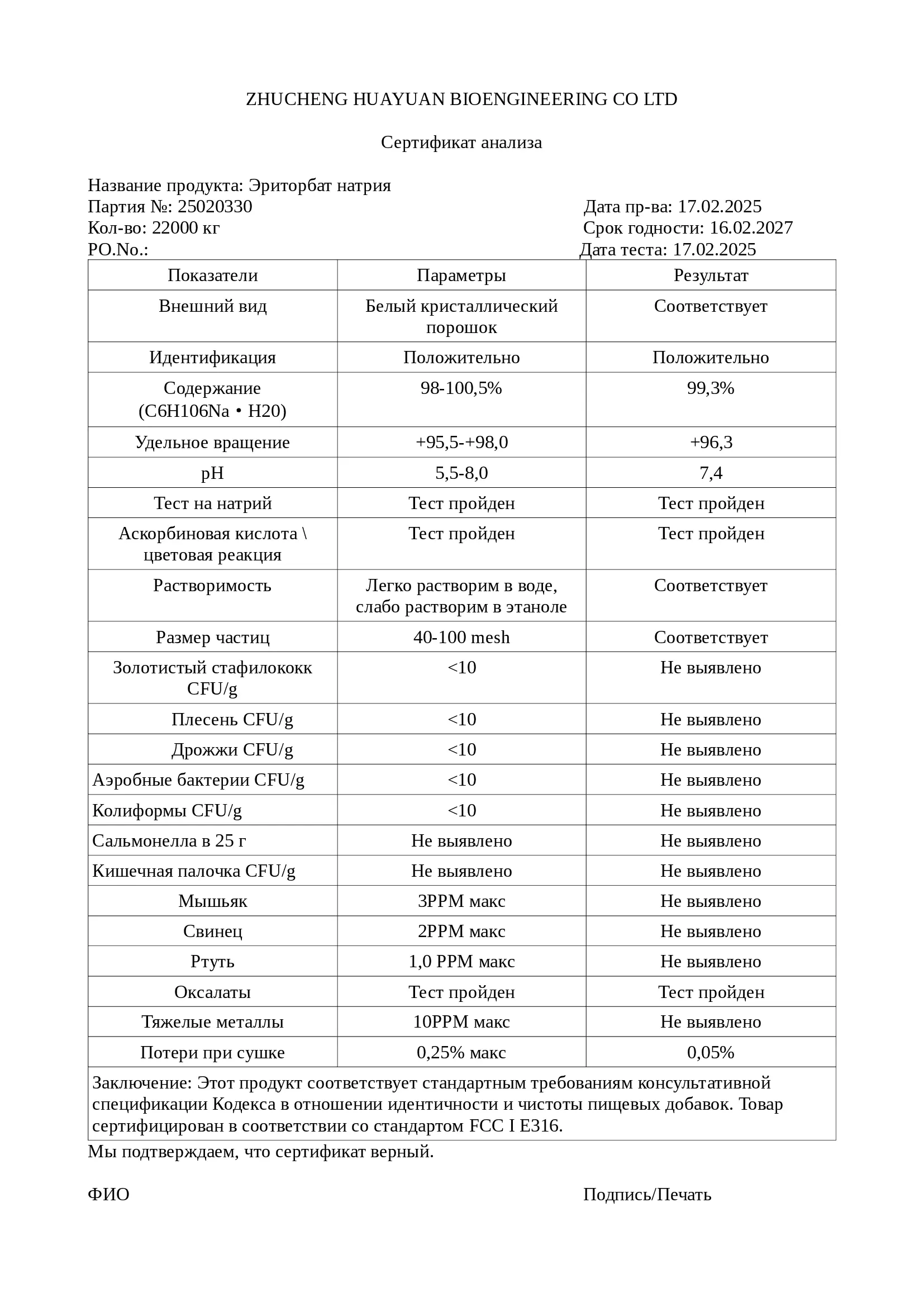 HUAYUAN / Изоаскорбат натрия (Эриторбат натрия) Е 316