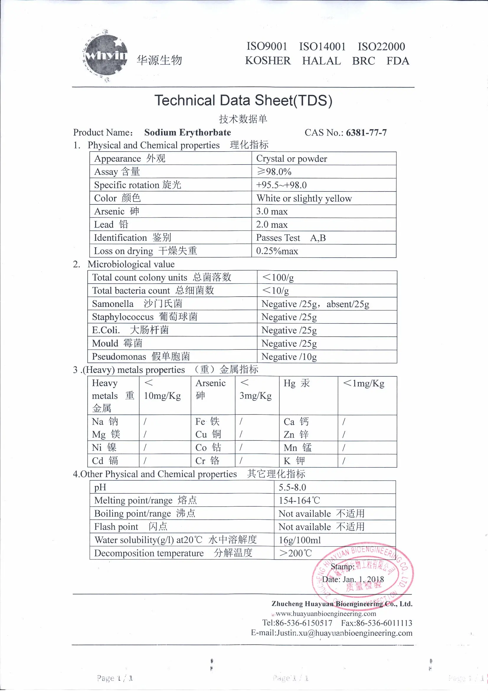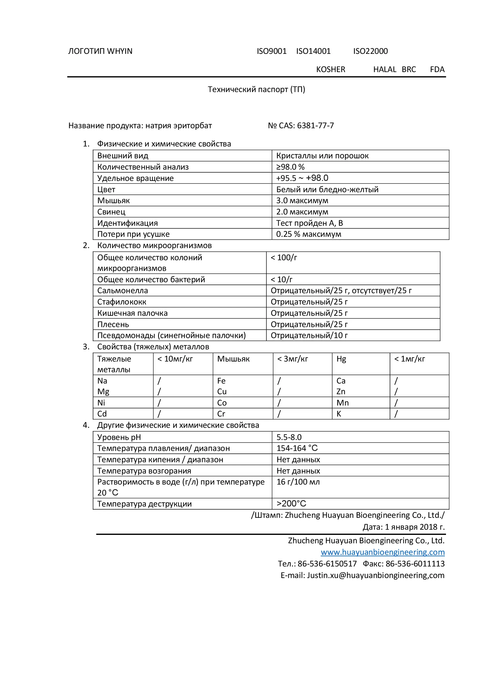 HUAYUAN /  Изоаскорбат натрия (Эриторбат натрия) Е 316