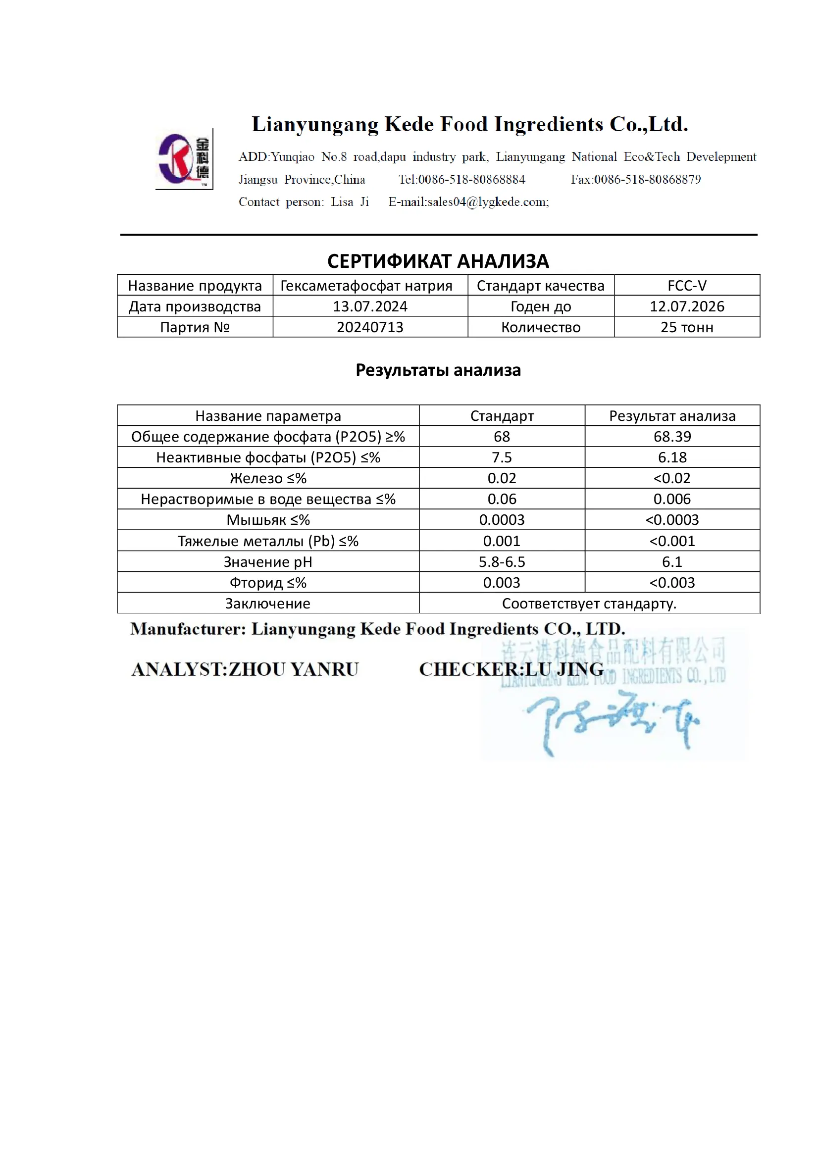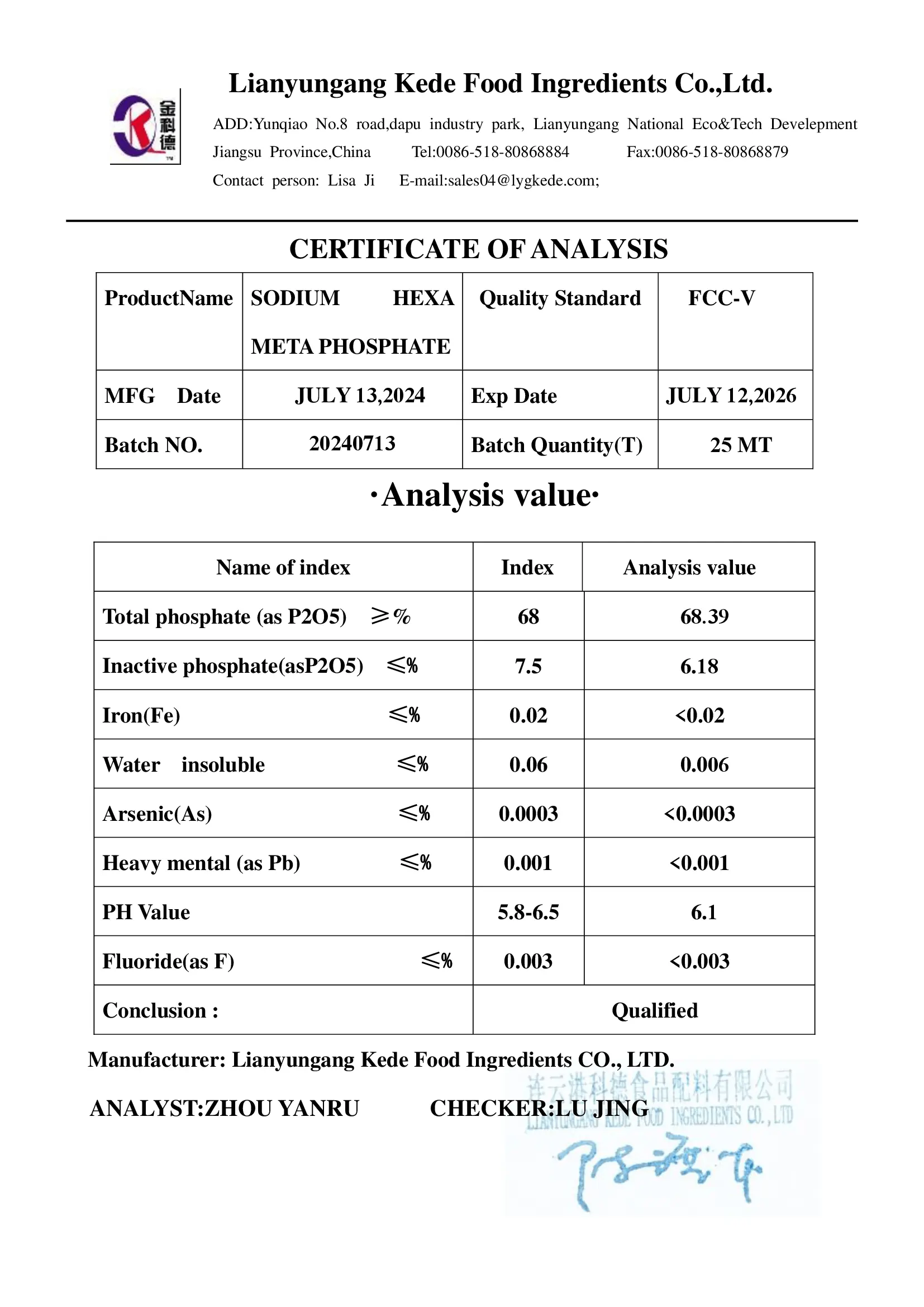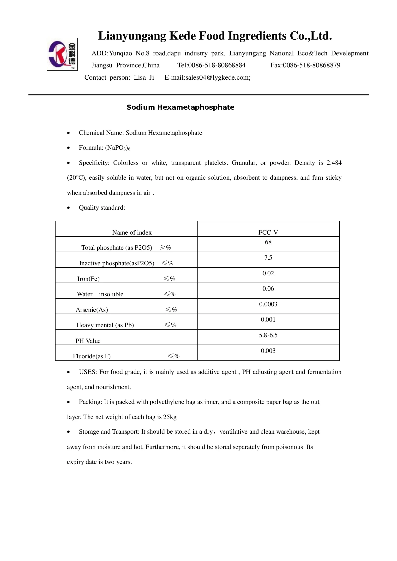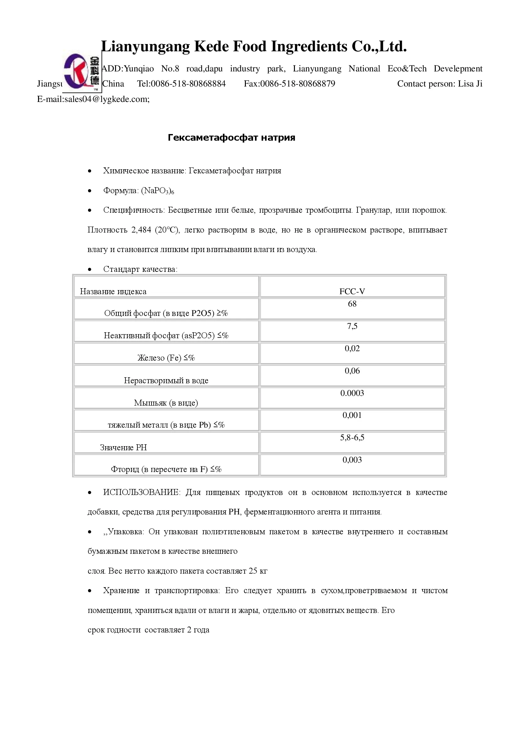 KEDE FOOD / Гексаметафосфат натрия Е452i, SHMP