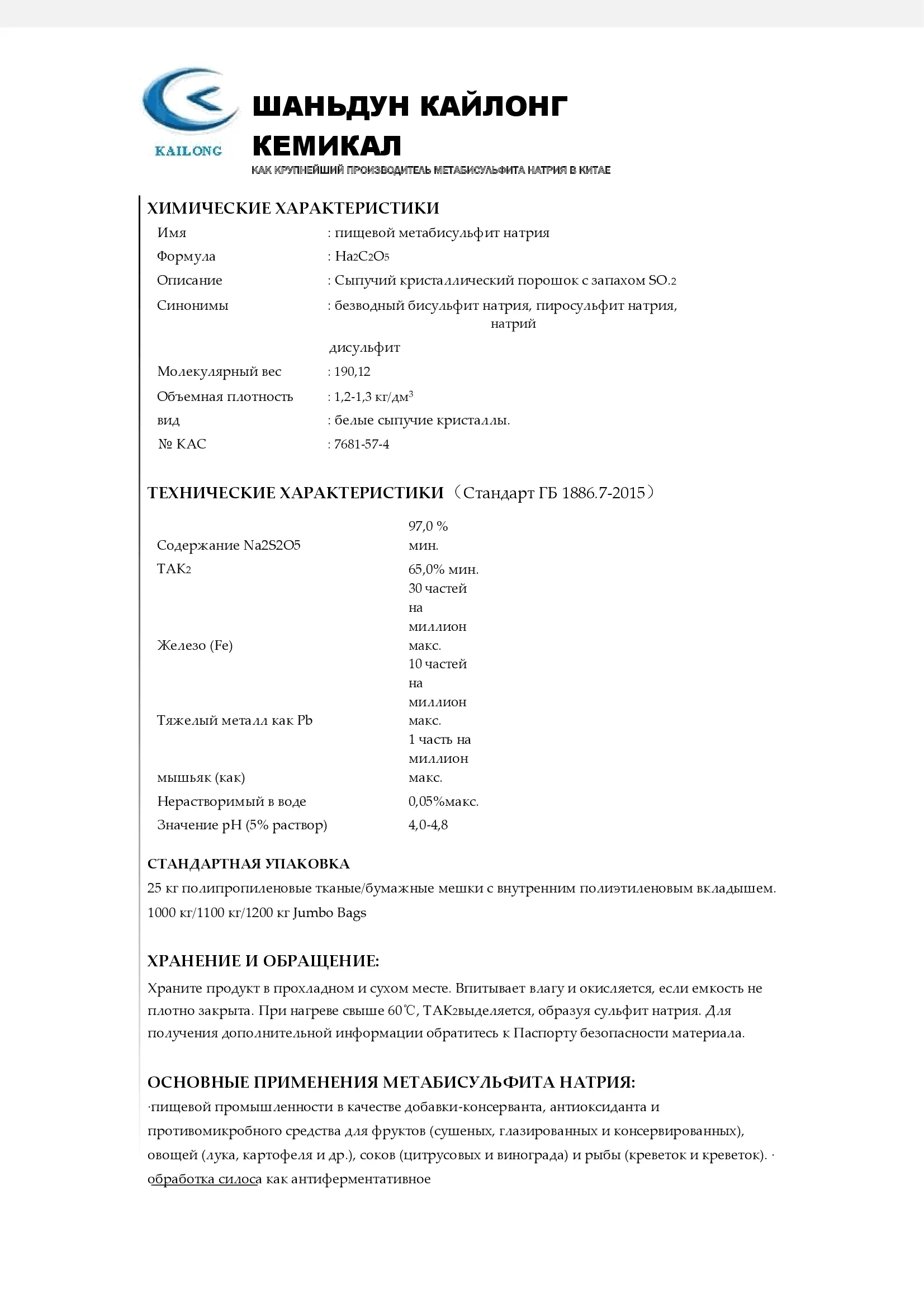 KAILONG / Метабисульфит (пиросульфит) натрия Е223