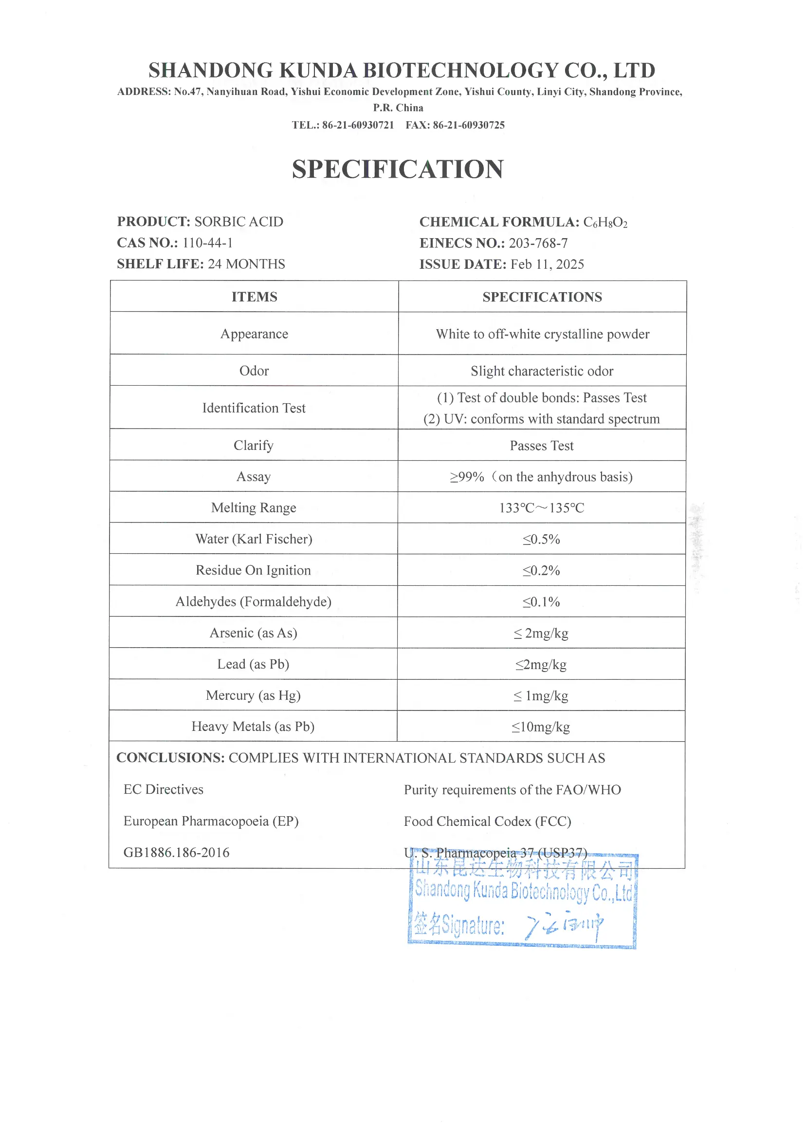 Названия синонимы: 2,4-Гексадиеновая кислота, 1,3 пентадион-1-карбоновая кислота; английский sorbic acid, 2,4-hexadienic acid; немецкий Sorbinsaure, Hexadien-Carbonsaure; французский acide sorbique, acide hexadienique