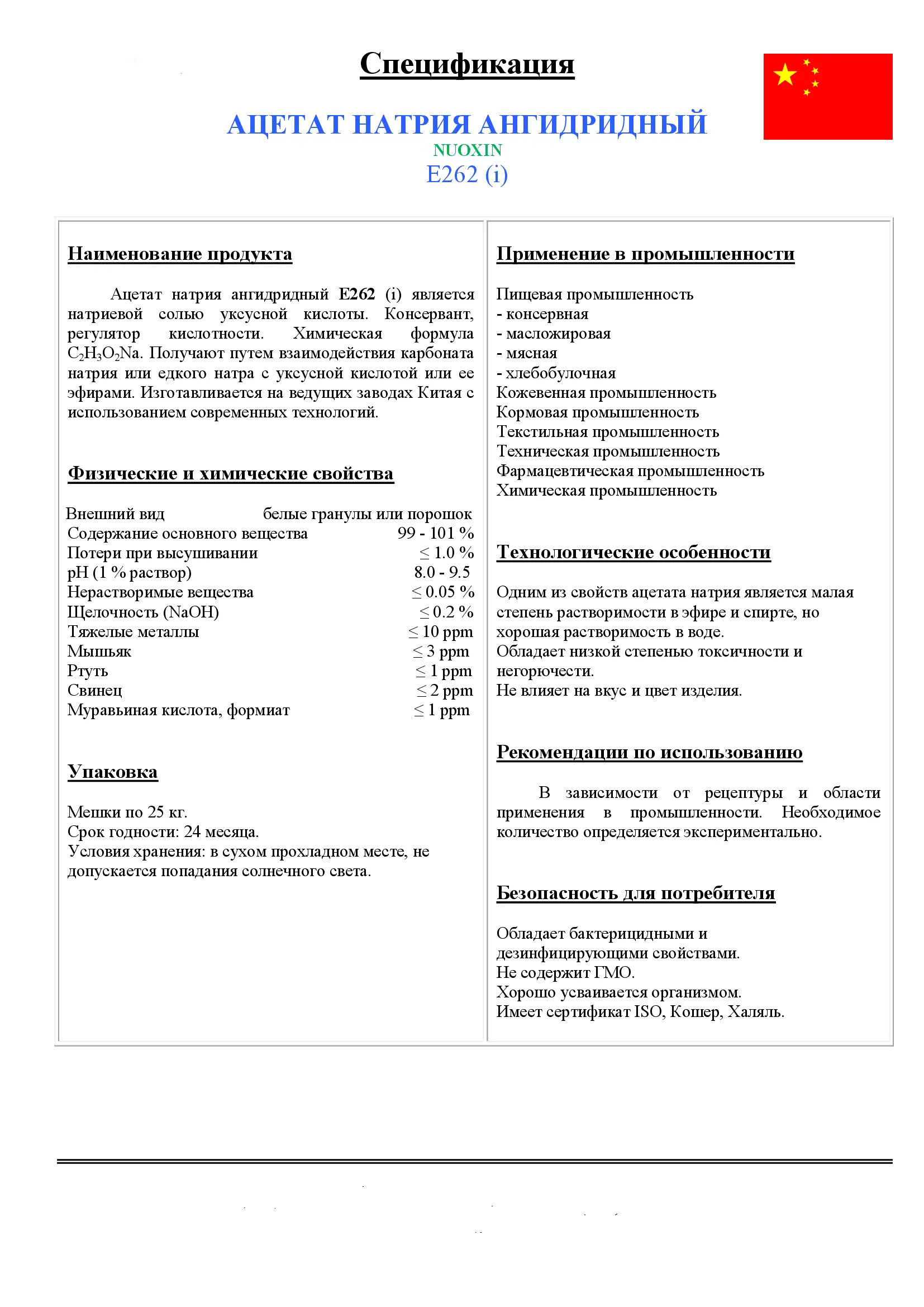 Применение: Пищевая добавка Е262 используется при консервировании овощей и фруктов для смягчения вкуса уксусной кислоты. Кроме этого, добавляя ацетат натрия вместе с ацетатом кальция в небольшом количестве в муку, производители защищают от бактерий «картофельной болезни» (Bacillus mesentericus) свою хлебобулочную продукцию. Также пищевая добавка Е262 используется в качестве ароматизатора при производстве чипсов, придавая продукции слегка уксусный вкус и аромат.