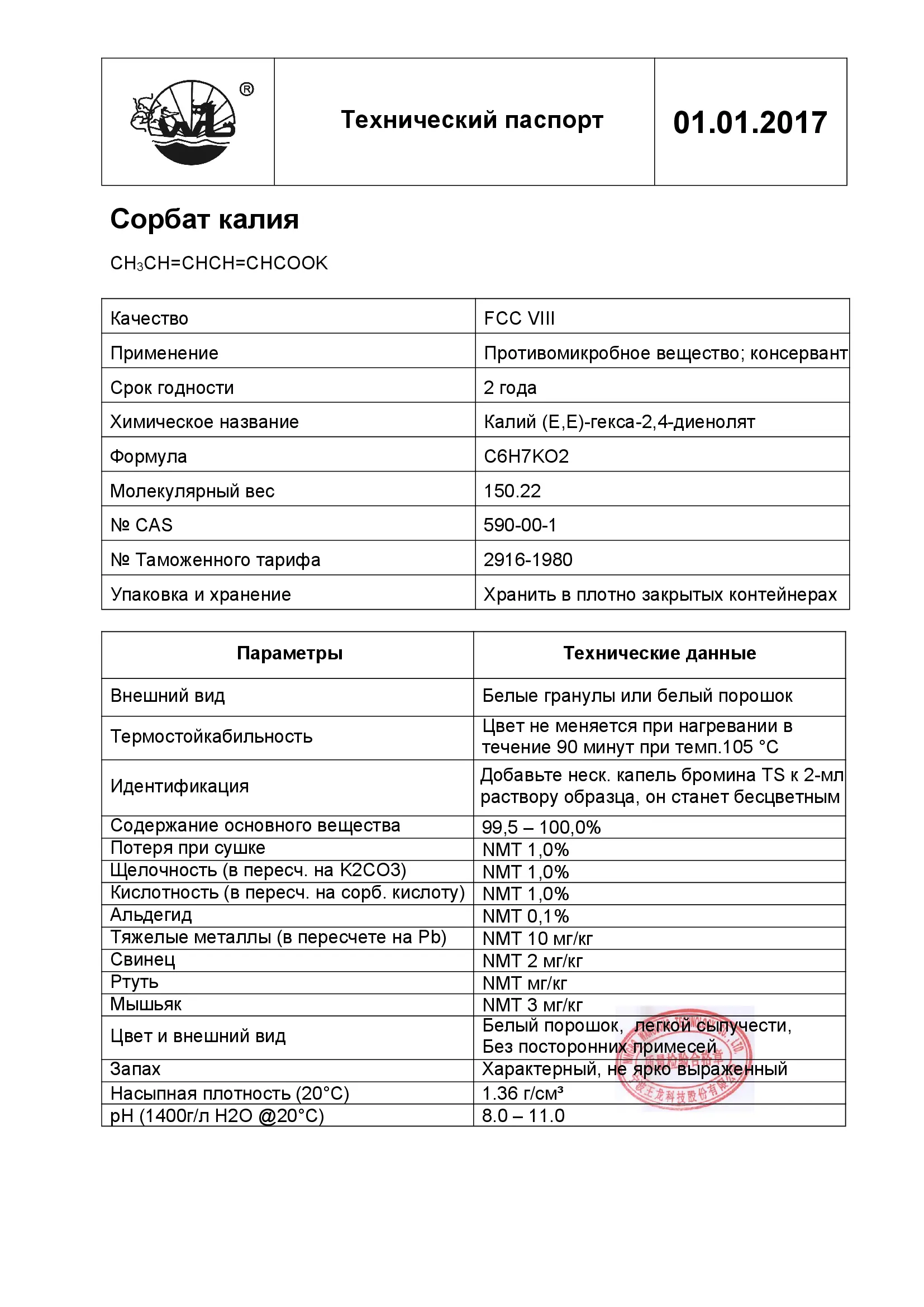 Химическое название: 2,4-Гексадиеноат калия