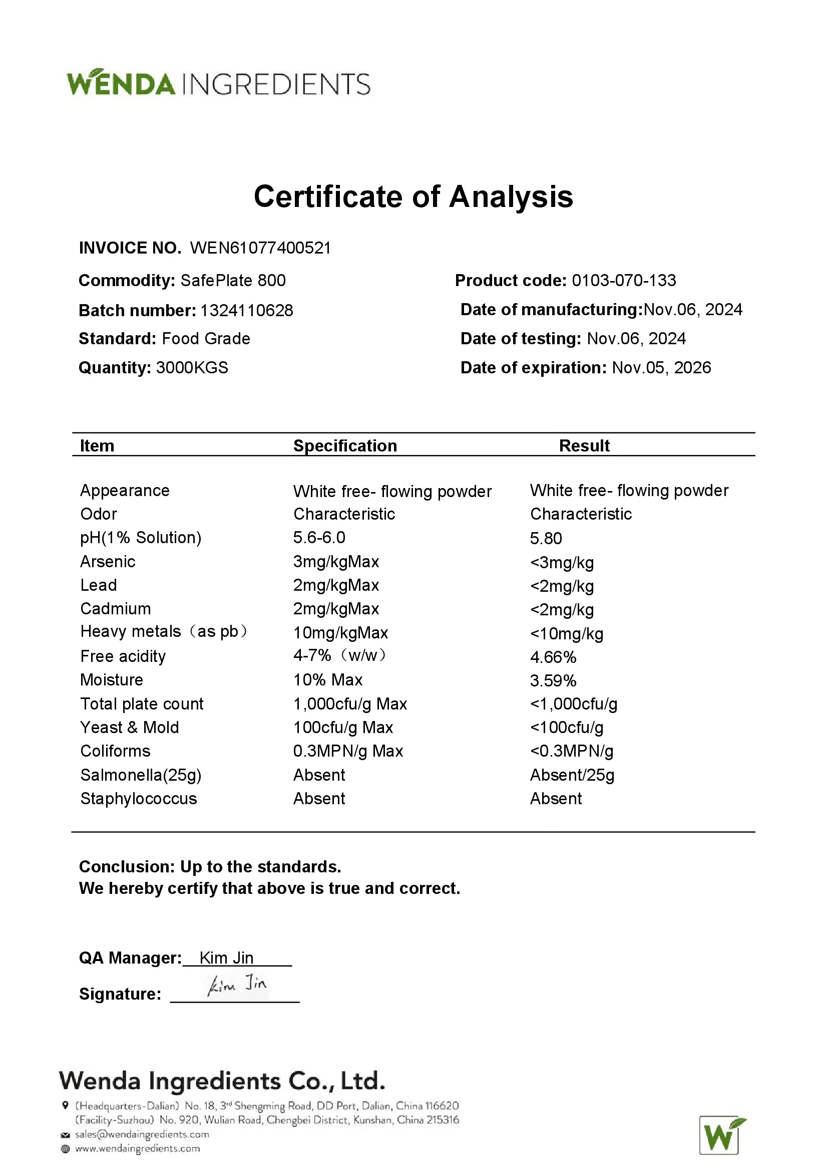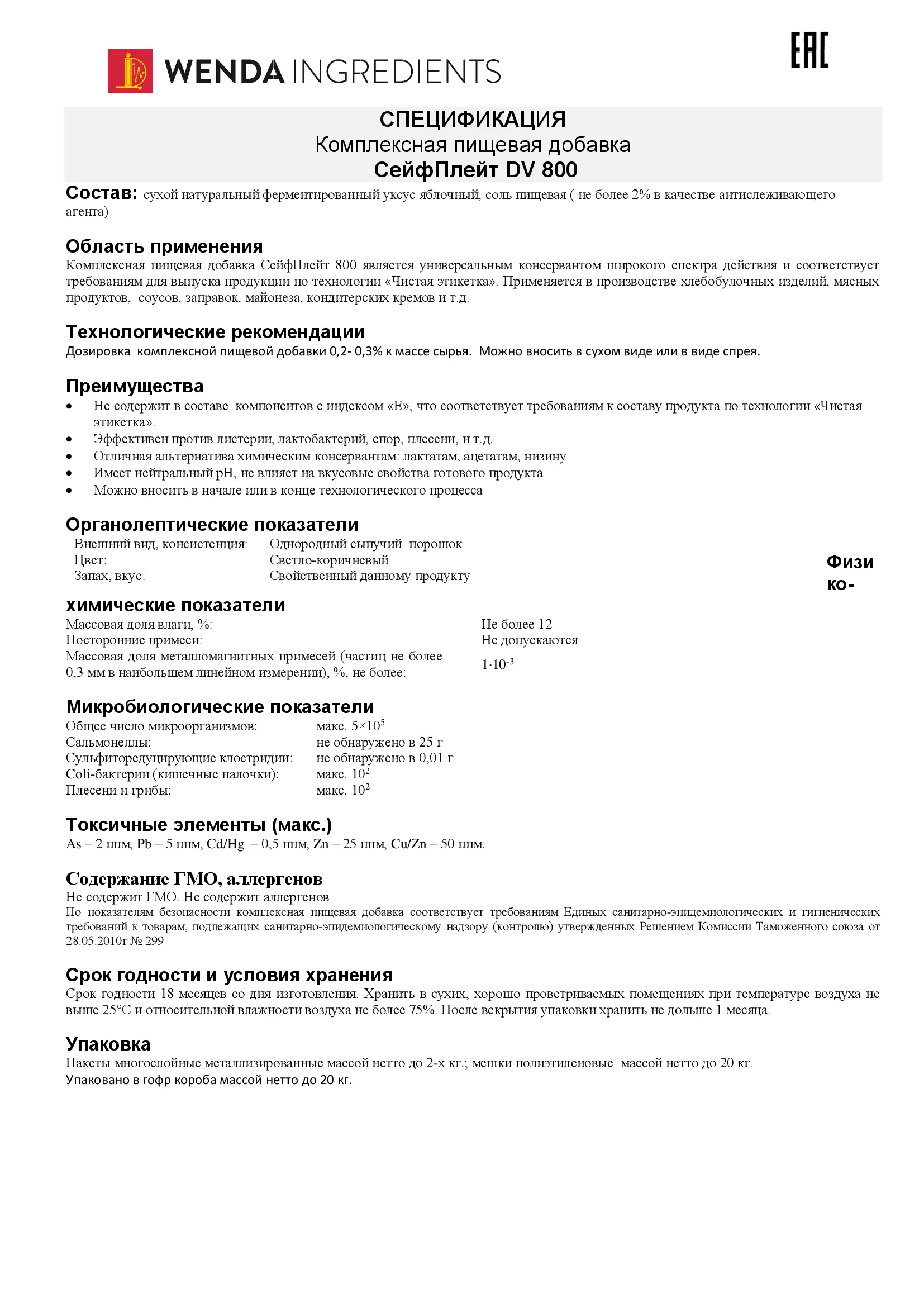 Комплексная пищевая добавка СейфПлейт 800 является универсальным консервантом широкого спектра действия и соответствует требованиям для выпуска продукции по технологии «Чистая этикетка». Применяется в производстве хлебобулочных изделий, мясных продуктов, соусов, заправок, майонеза, кондитерских кремов. Состав: сухой натуральный ферментированный уксус яблочный, соль пищевая (не более 2% в качестве антислеживающего агента). Является отличной альтернативой химическим консервантам, эффективен против листерии, лактобактерий, спор, плесени.