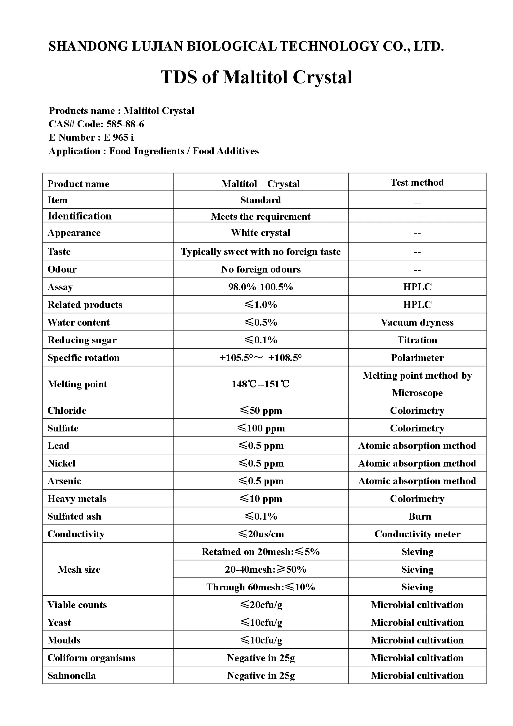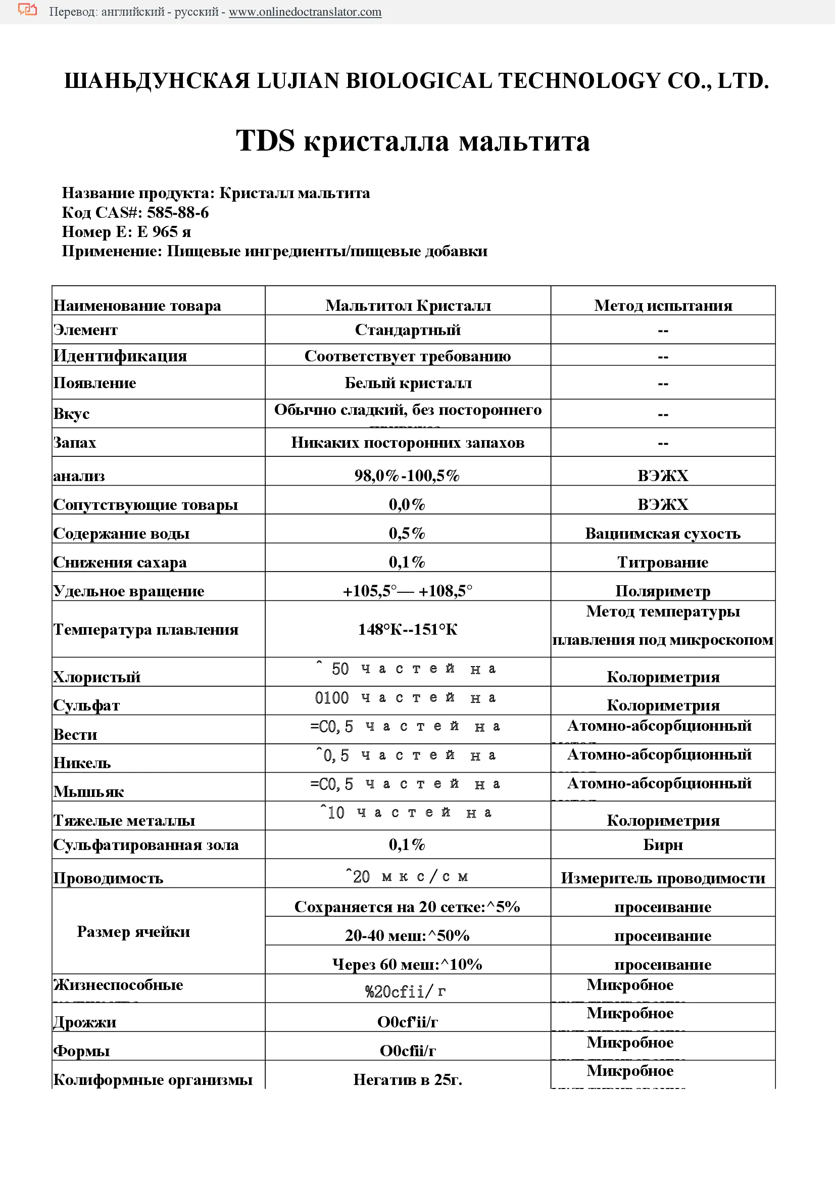 Физико-химические свойства: Тпл148-151°С (чистое вещество), примеси длинноцепочечных Сахаров снижают способность мальтита к кристаллизации и его температуру плавления. Устойчив к гидролизу до рН 3. Удельное вращение [а]D20(5%-й раствор) от 105,5 до 108,5 градусов. Хорошо растворим в воде; средне растворим в спирте; нерастворим в жирных растворителях