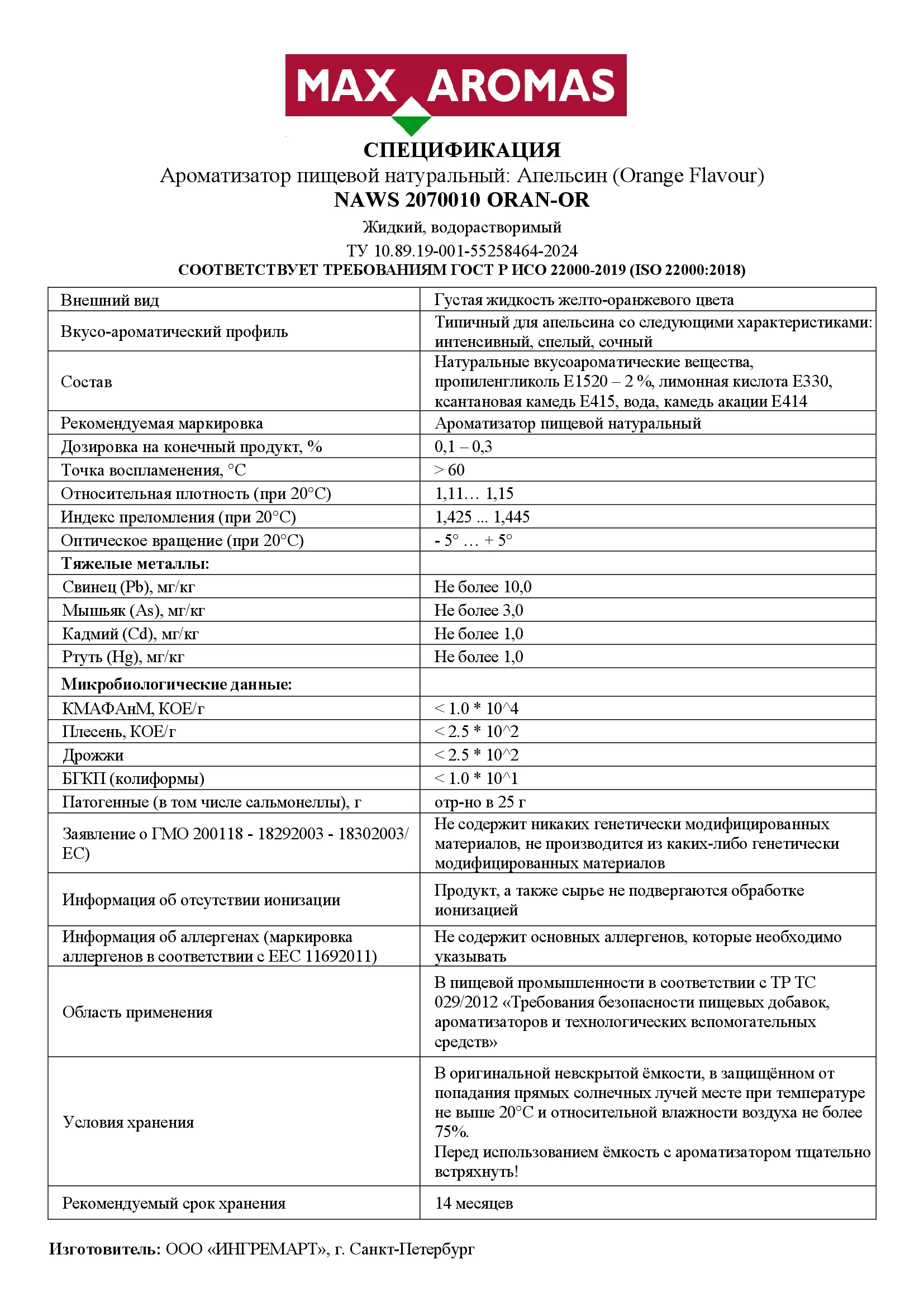 Органолептические свойства: жидкость прозрачного цвета, имеет насыщенный цитрусовый аромат апельсина