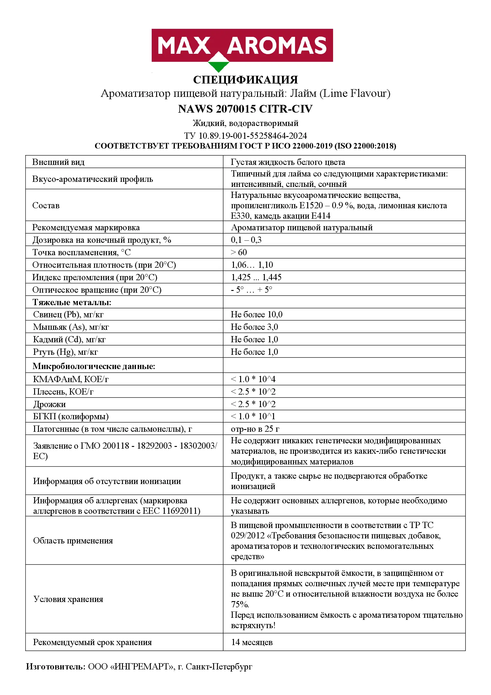 MAX AROMAS / Ароматизатор пищевой Лайм NAWS 2070015 натуральный, жидкий, водорастворимый, термостабильный