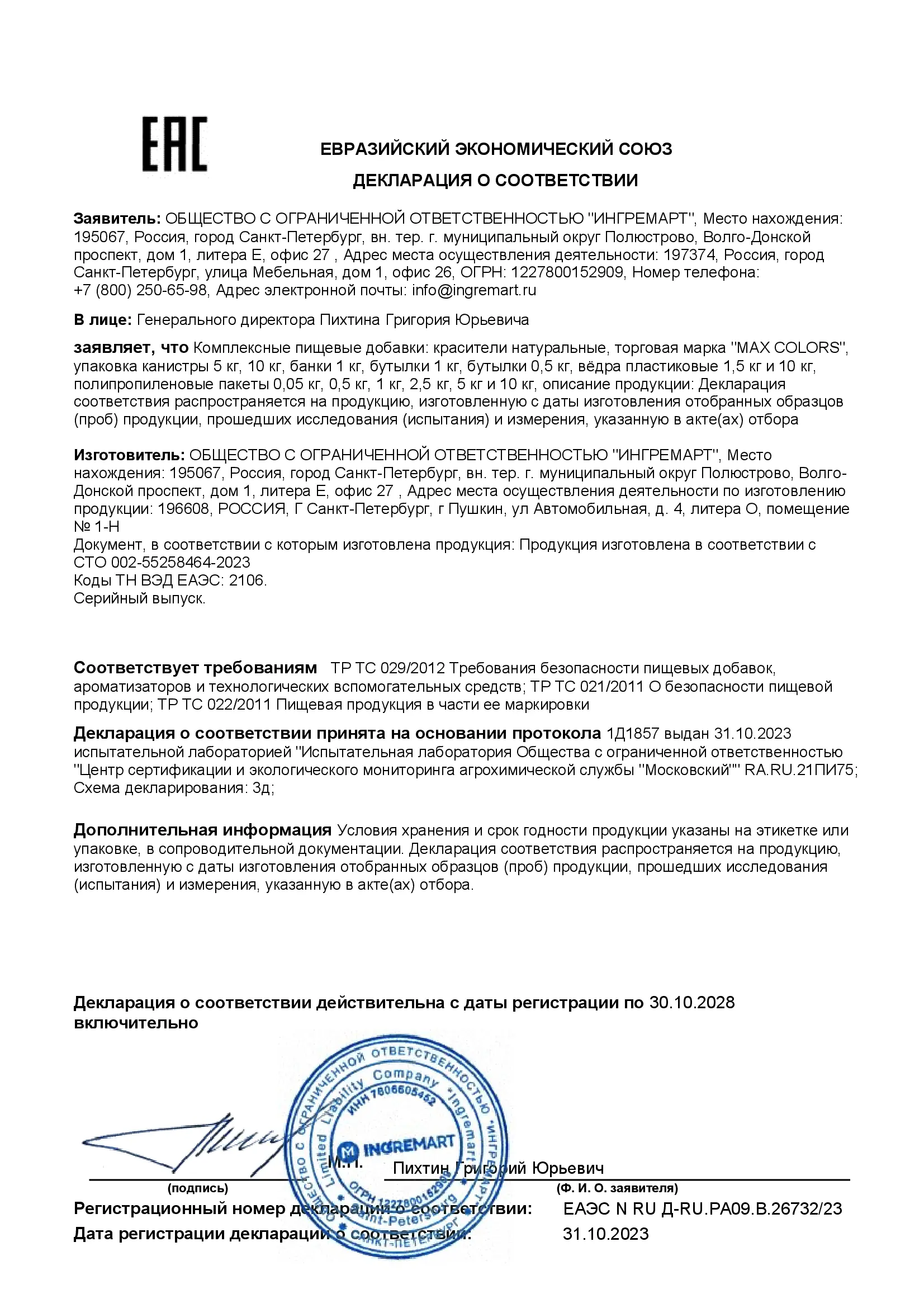 Преимущества: обеспечивает яркие натуральные и стойкие цвета, без постороннего запаха и вкуса, обладает высокой устойчивостью к изменению pH среды, сохраняет интенсивность цвета при воздействии высоких и низких температур, редуцирующих сахаров и фруктовых кислот, хорошо смешивается с другими красителями, устойчив к любым условиям технологической обработки и длительному хранению; полностью соответствует тренду натуральности и «чистой» этикетки