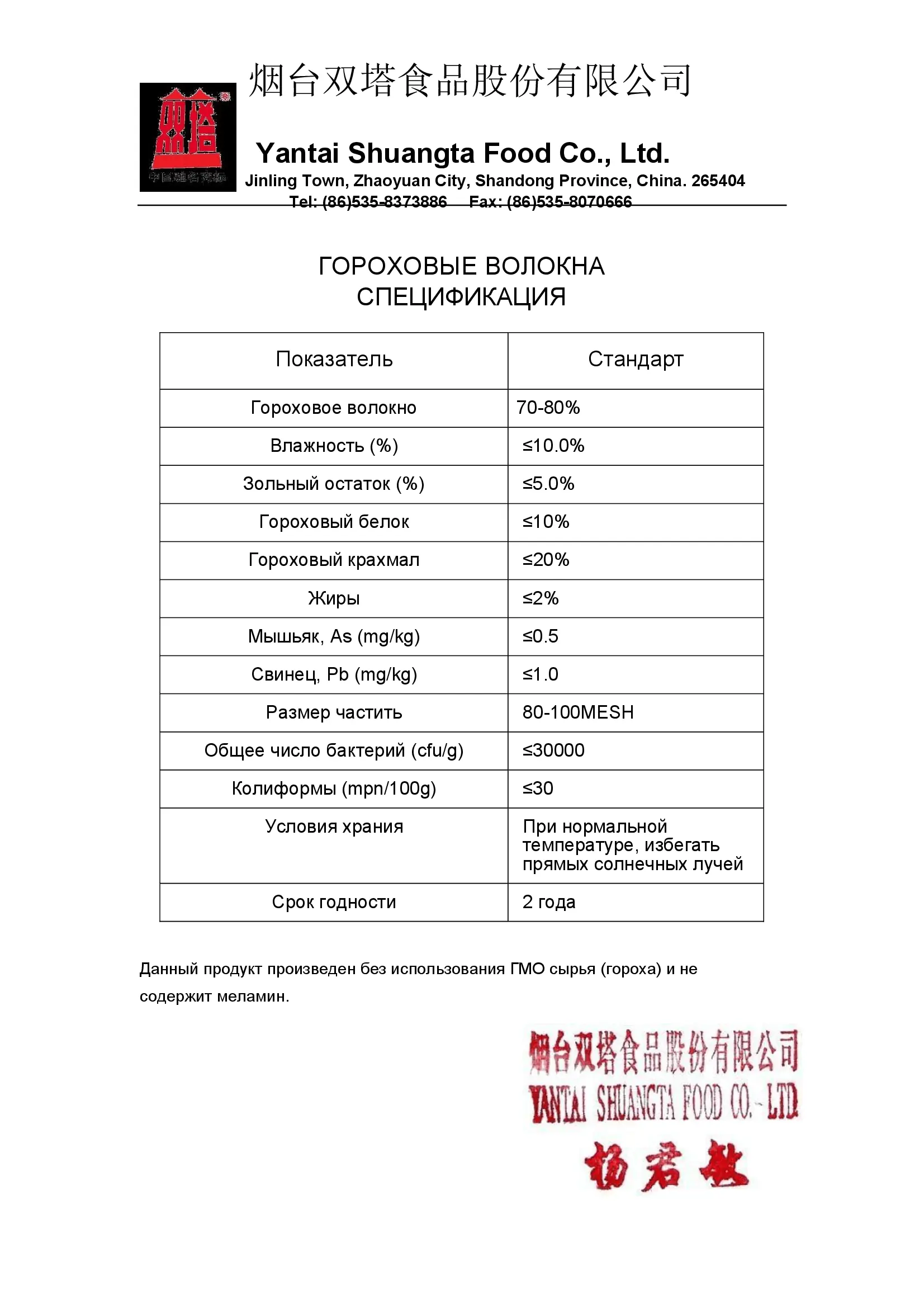 Гороховые волокна - это клетчатка, полученная из сердцевины семян гороха. Представляет собой природный комплекс растворимых и нерастворимых пищевых волокон, структурно связанных с волокнами нативного крахмала и белковыми молекулами. По внешнему виду гороховые волокна - это порошок желтоватого или молочно-белого цвета с нейтральными вкусом и запахом, обладающий рекордно высокой влагоудерживающей (1:12) и эмульгирующей способностью. Гороховые волокна безопасны для здоровья, не являются пищевой добавкой, не имеют Е-индекса, без ГМО, не содержат глютена (белка злаков).