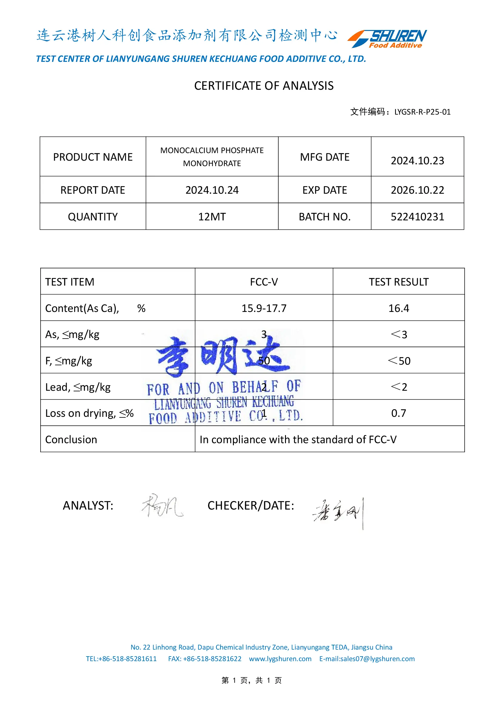 Названия синонимы: бис(дигидрофосфат)кальция, монокальцийфосфат, дигидроортофосфат кальция, монокальциевая соль ортофосфорной кислоты, ортофосфат кальция однозамещенный; английский monocalcium phosphate, calcium dihydrogen phosphate; немецкий Monocalciumphosphat, Calciumdihydrophosphat; французский phosphate de monocalcium
