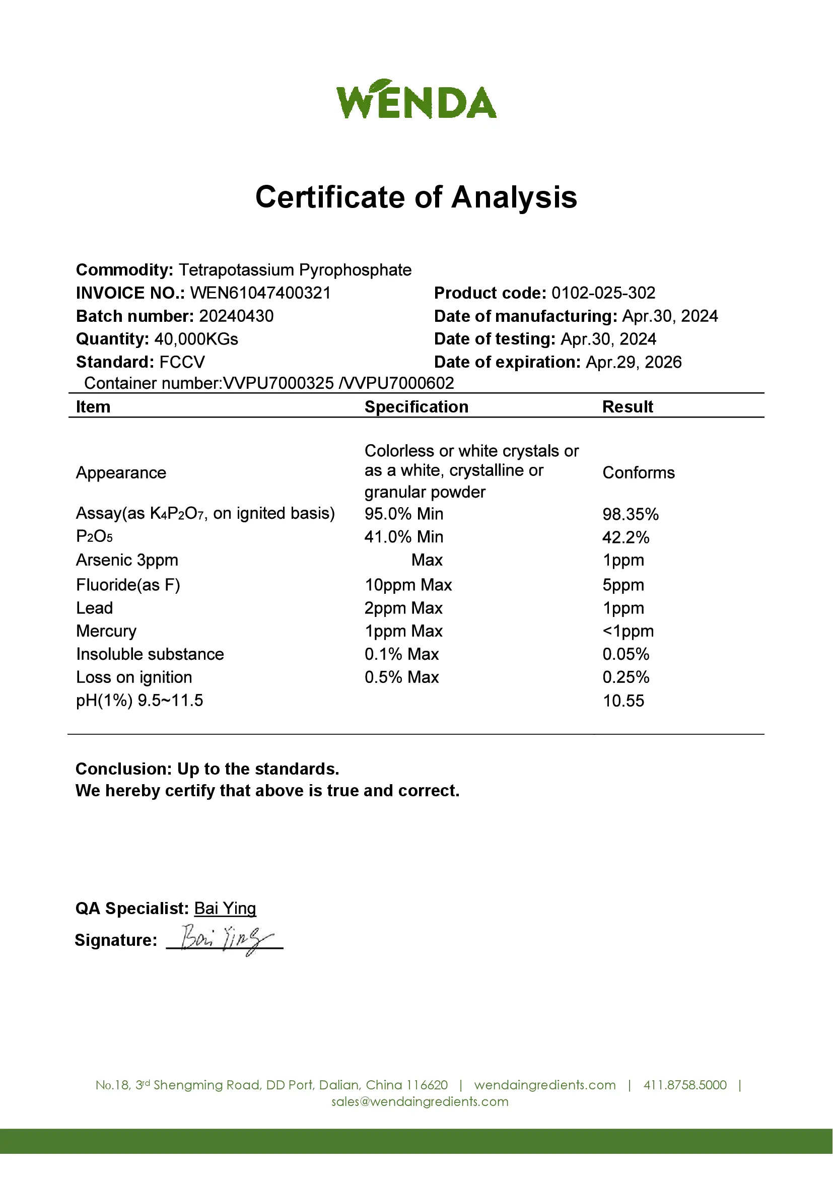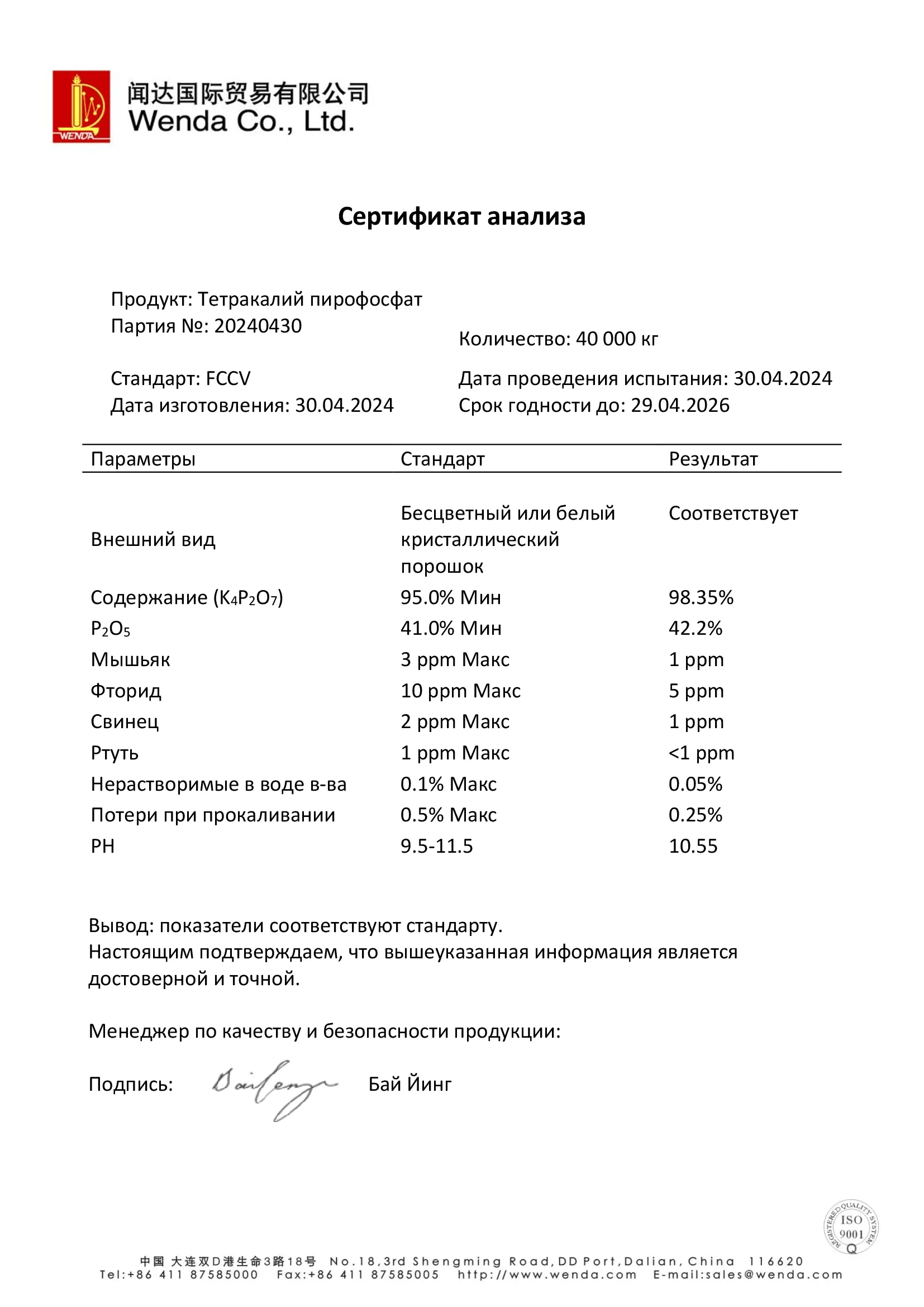 Применение: В производстве мясных и рыбных фаршевых изделий добавляют пирофосфаты калия одни или совместно с другими фосфатами в количестве 0,3% от массы фарша. Фосфаты способствуют набуханию мышечных белков, влагоудержанию при варке, увеличению сочности и выхода фаршевых изделий. Они обеспечивают стойкость жировых эмульсий, что предотвращает образование бульонно-жировых отёков при варке колбас, тормозят окислительные процессы в жире. При введении фосфатов структура фарша улучшается. Пирофосфаты применяются также в производстве плавленых сыров в качестве солей-плавителей. Часто используются вместе с другими фосфатами и цитратами.