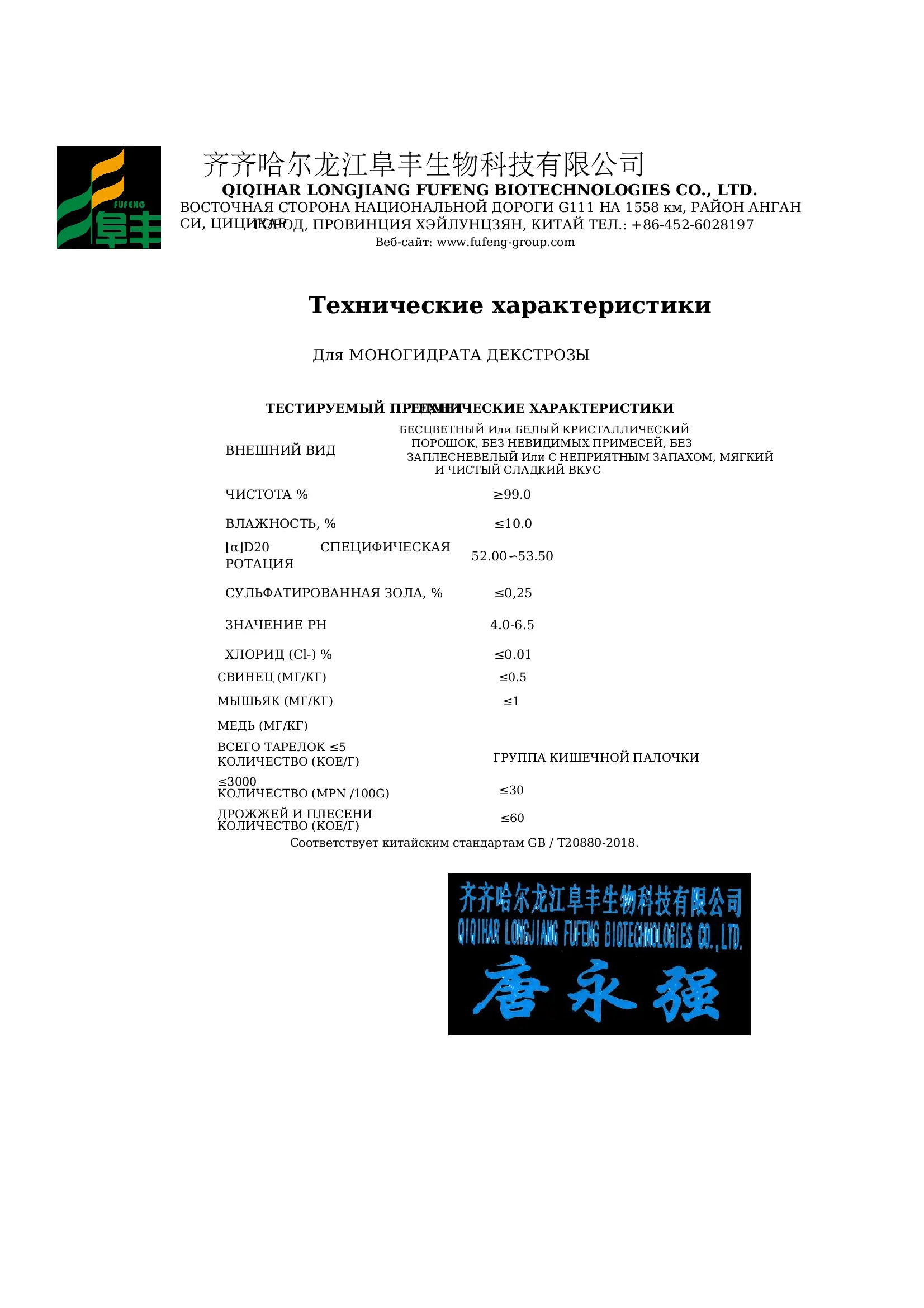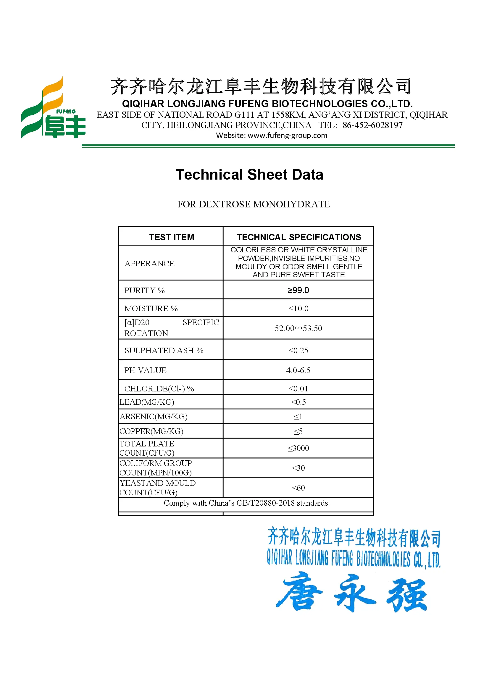 Глюкоза декстроза Fufeng (декстрозы моногидрат) – органическое соединение, относящееся к классу углеводов моносахаридов. Химическая формула – С6H12O6 (очищенная Д-глюкоза в виде кристаллов с одной молекулой воды). Внешне это вещество представляет собой белый порошок с высоким уровнем растворимости. Для промышленных целей его получают путем специальной обработки кукурузного или картофельного крахмала.