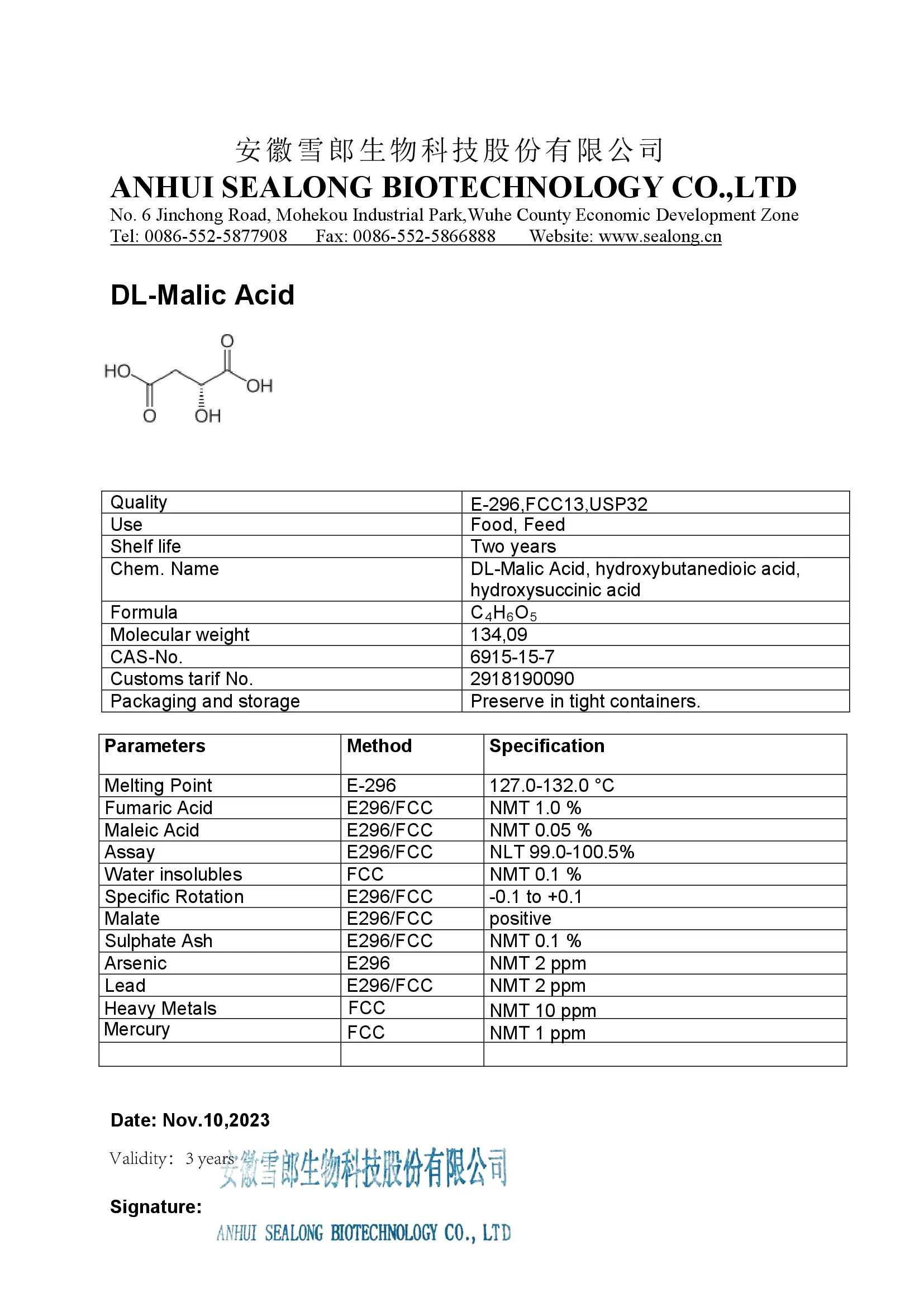 Названия синонимы: гидроксиянтарная кислота; английский malic acid, hydroxysuccinic acid, pomalous acid; немецкий Apfelsaure, Hydroxibernsteinsaure; французский acide malique, acide hydroxysuccinique