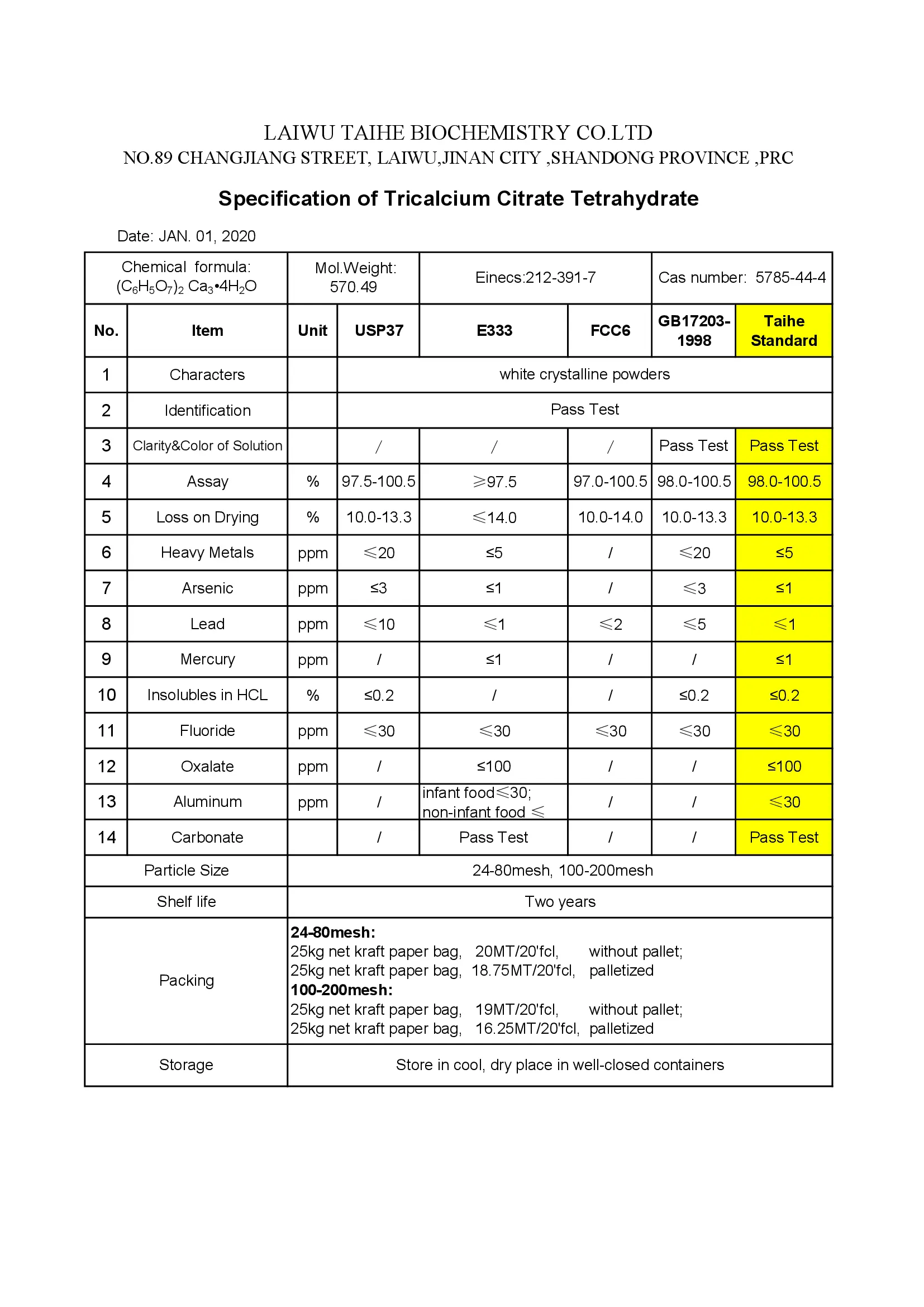 Названия синонимы: кальциевые соли лимонной кислоты, трикальцийдицитрат, трикальцийдицитрат четырёхводный; английский calcium citrates, calcium salts of 2-hy-droxy-l,2,3-propanetricarboxylic acid, calcium salts of citric acid, calcium salts of (3-hydroxy-tricarballylic acid; немецкий Calciumsalze der Citronensaure, Calciumcitrate; французский calcium sels de l'acide citrique