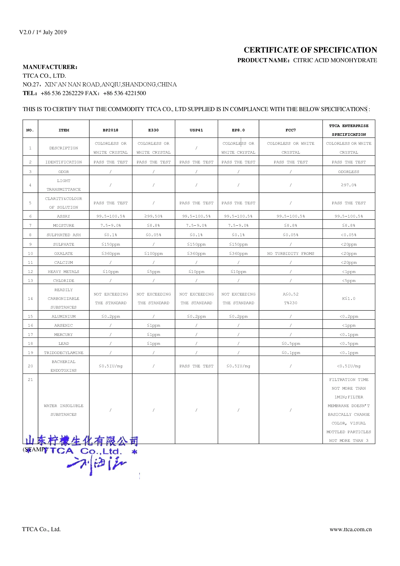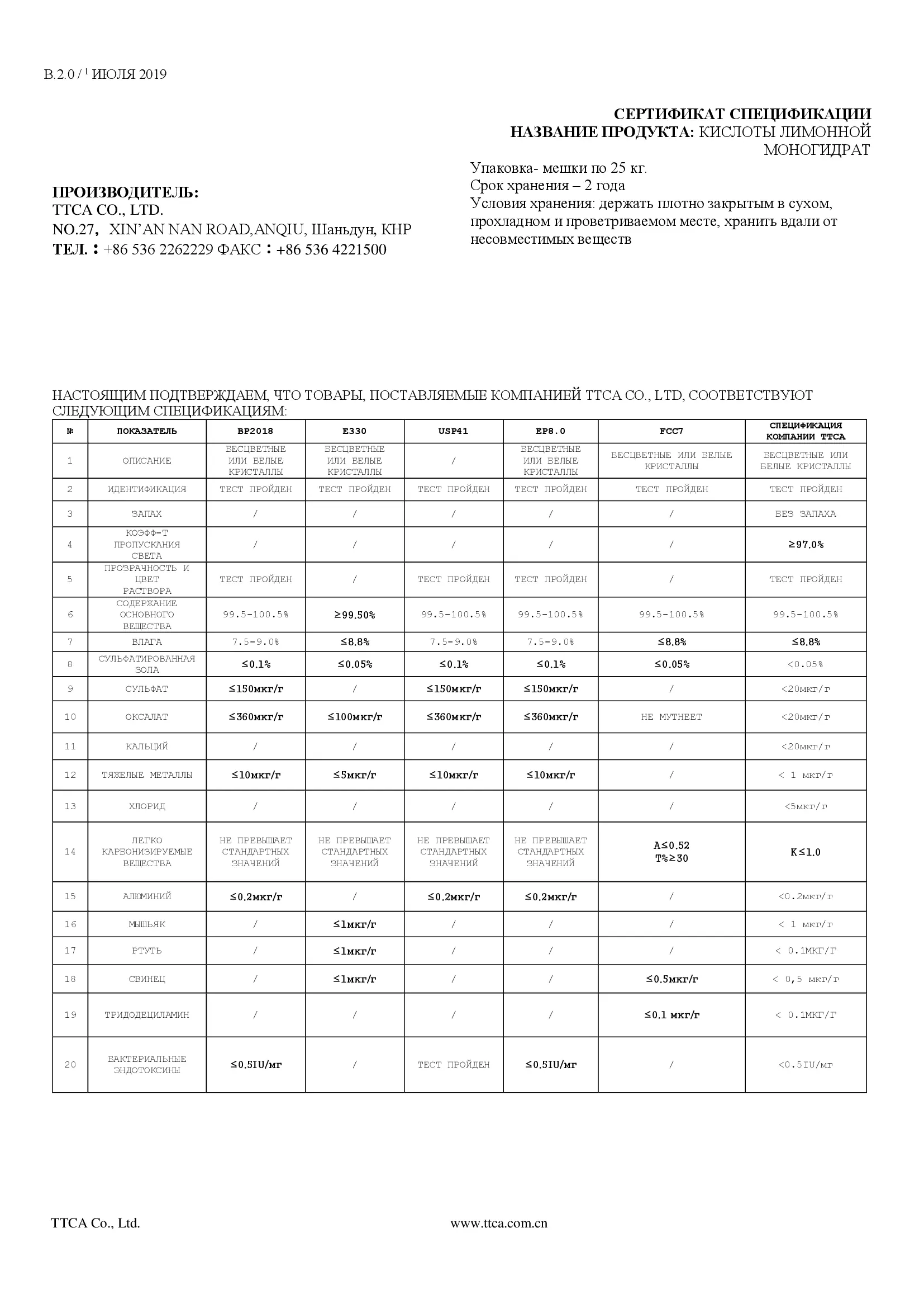 Производственные стандарты: BP/USP/FCC/E330/GB1886.235-2016