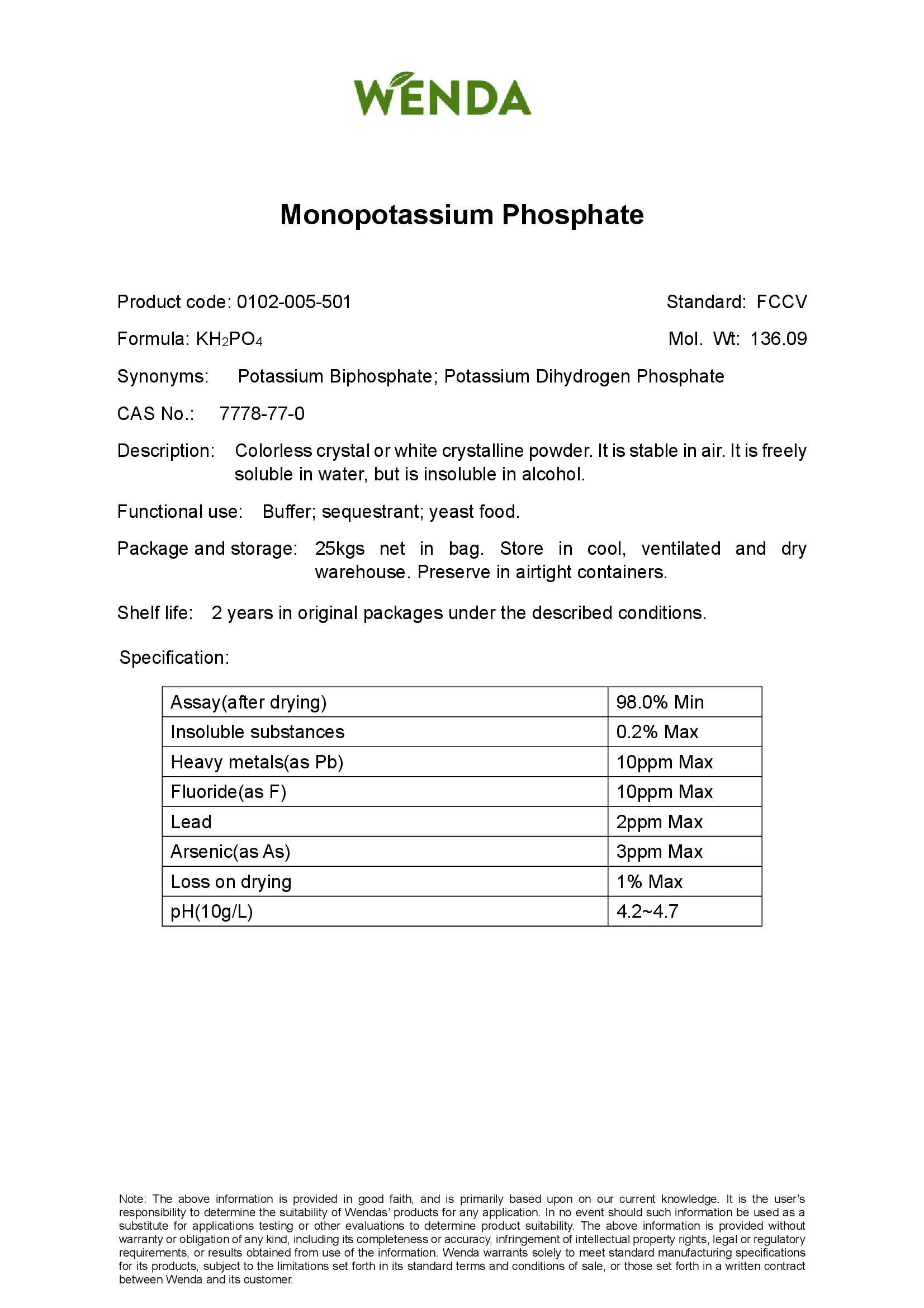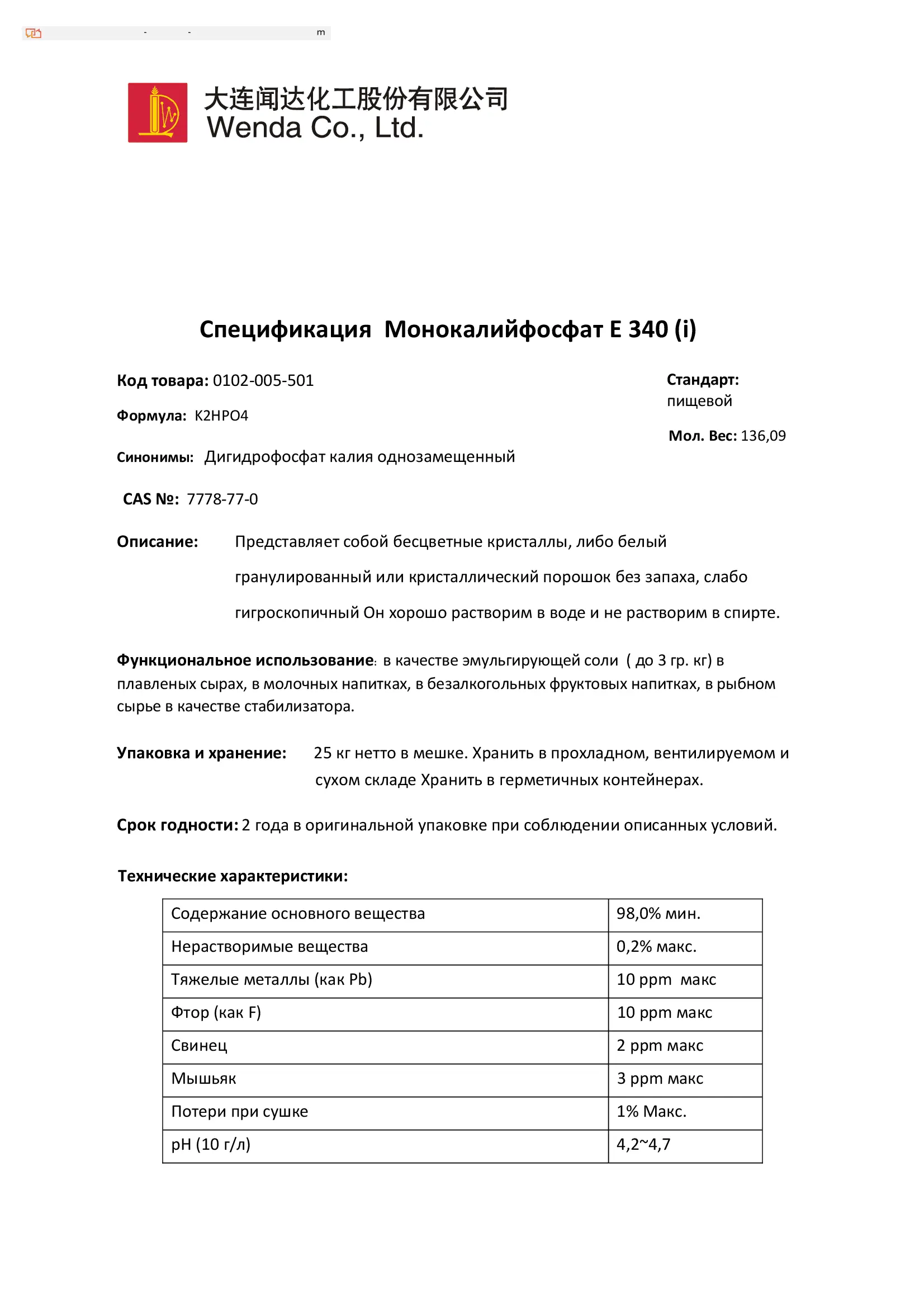 WENDA / Орто-фосфат калия E340(i), МКР